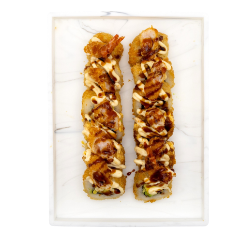 Roll frit,Tempura de crevette, avocat, cream cheese, sauce teriyaki. Allergénes: oeuf , céréale, produit laitier ,crustacé.
